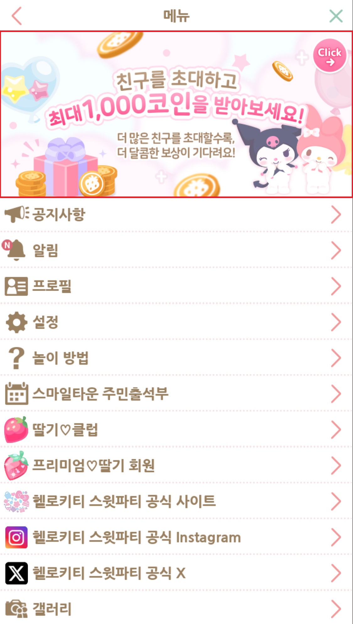 A, 친구로부터 공유 받은 초대 링크를 클릭하면 앱스토어로 이동하여 헬로키티 스윗파티를 설치하고 계정을 생성할 수 있습니다.